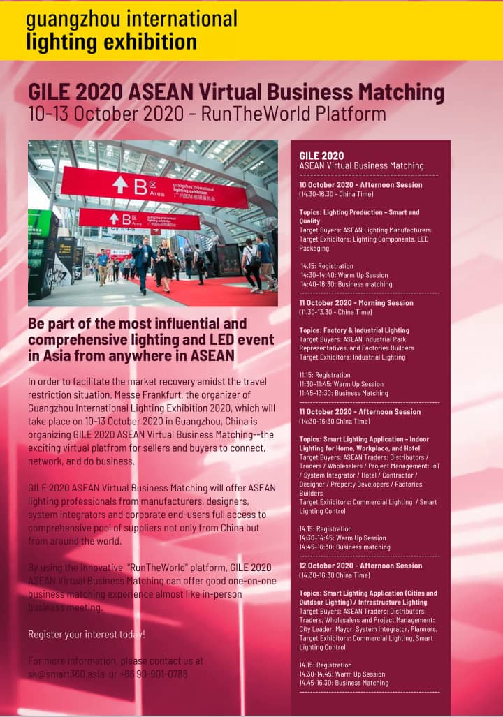 However, due to travel restriction being imposed in response to the pandemic, visitors and buyers might find it difficult to visit the show. In order to facilitate ASEAN lighting industry, the Organiser Guangzhou Guangya Messe Frankfurt (HK) Ltd., is launching GILE 2020 ASEAN Virtual Business Matching Program. This exciting virtual event will offer excellent opportunities for ASEAN lighting professionals from manufacturers, designers, system integrators to corporate end-users full access to comprehensive pool of lighting suppliers not only from China but from around the world.