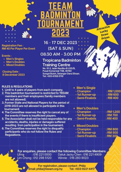 All TEEAM members & staff are invited to participate in the upcoming TEEAM Badminton Tournament 2023 scheduled on 16 & 17 Dec 2023 at Tropicana Badminton Training Centre (in Sg Buloh). See below for detailed flyer, entry form and sponsorship form. TEEAM Badminton Entry Form 2023 | |