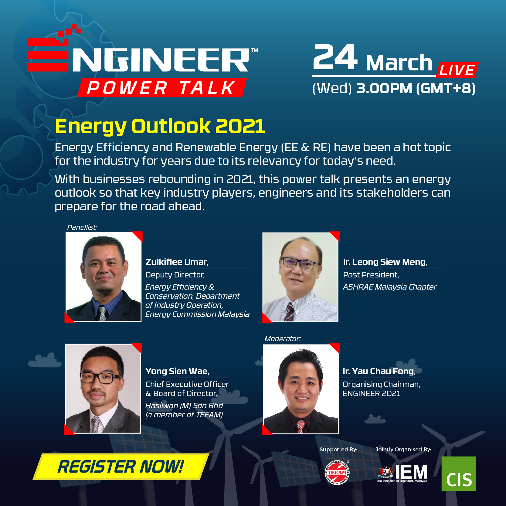 THE ENGINEER POWER TALK Covering the latest Energy Outlook for 2021, discover new opportunities for your business as we find out how Energy Efficiency and Renewable Energy (EE & RE) could impact the engineering community and its stakeholders. The latest Power Talk edition will cover: * The benefits of adopting EE & RE for sustainability Join this session and identify new sustainable solutions and resilient growth for your business as the panellist share their views on the challenges faced by the industry – not just during the pandemic but also on the status of the industry relating to EE and RE solutions. Date: 24 March 2021, Wednesday Panellist: Moderator: The Talk is organised by IEM & CIS, and supported by TEEAM. To secure your seat, CLICK on the LINK below to REGISTER: | |