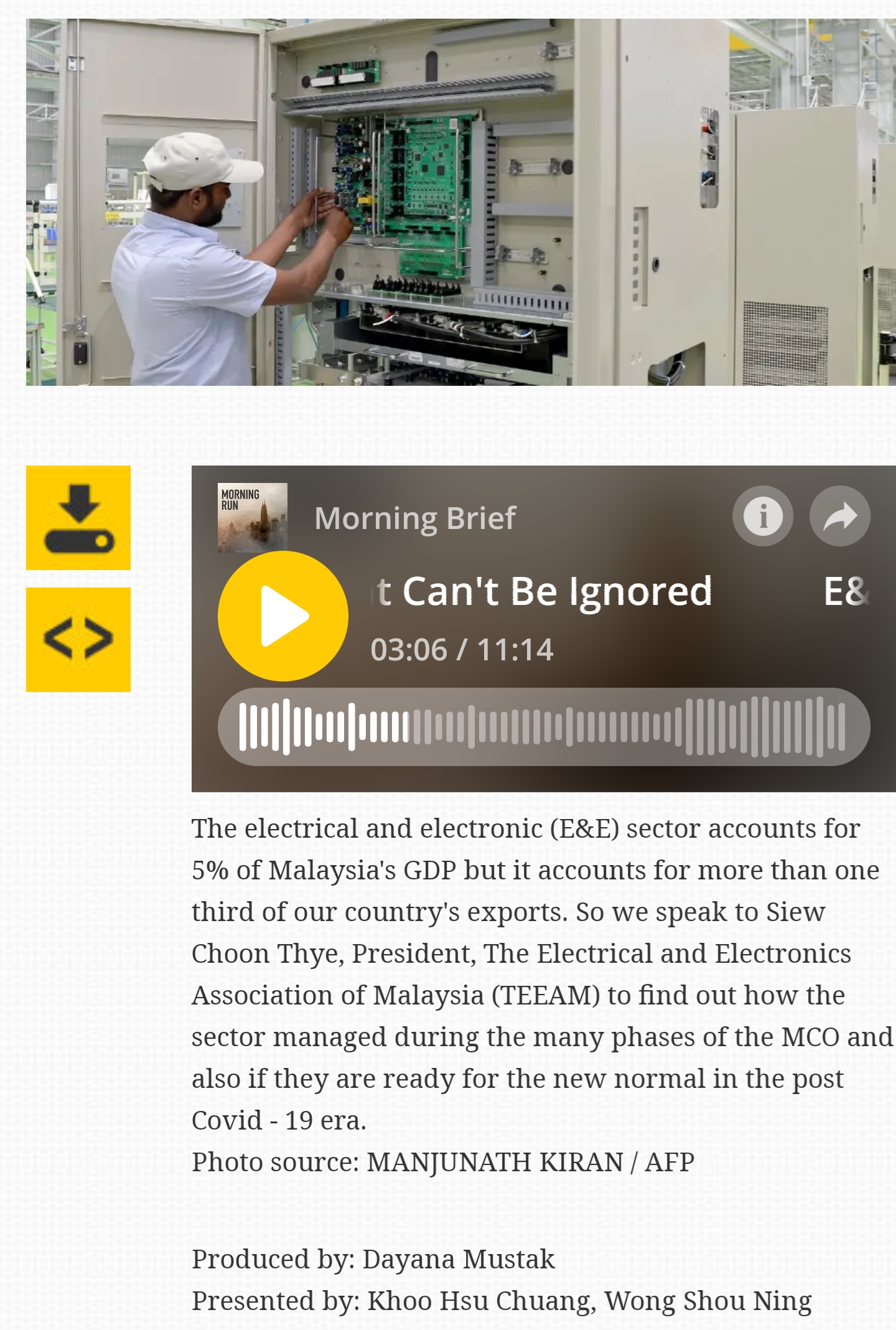 July 23 - The electrical and electronic (E&E) sector accounts for 5% of Malaysia's GDP but it accounts for more than one third of our country's exports. BFM 89.9 Business Radio Station spoke to Mr Siew Choon Thye, President of The Electrical and Electronics Association of Malaysia (TEEAM) to find out how the sector managed during the many phases of the MCO and also if TEE...