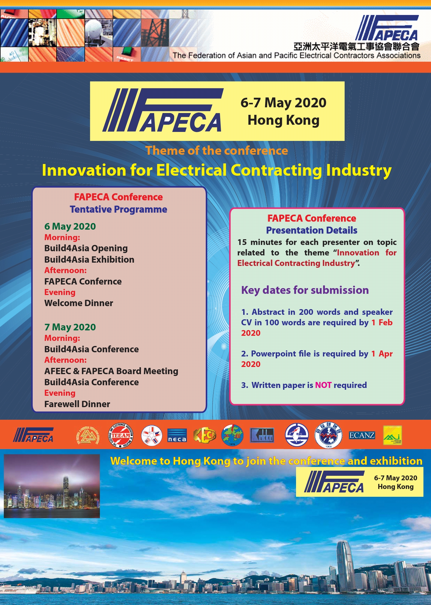 The 2020 Conference and Meeting of the ASEAN Federation of Electrical Engineering Contractors (AFEEC) and the Federation of Asian Pacific Electrical Contractors Associations (FAPECA) will be held from 6 - 7 May 2020 in Hong Kong. The event will be hosted by the Hong Kong Electrical Contractors' Association (HKECA). ...