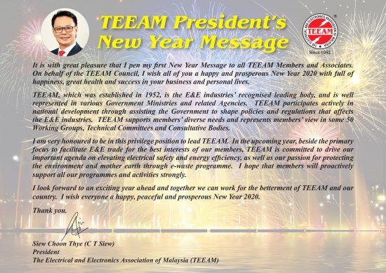 It is with great pleasure that I pen my first New Year Message to all TEEAM Members and Associates. On behalf of the TEEAM Council, I wish all of you a happy and prosperous New Year 2020 with full of happiness, great health and success in your business and personal lives.