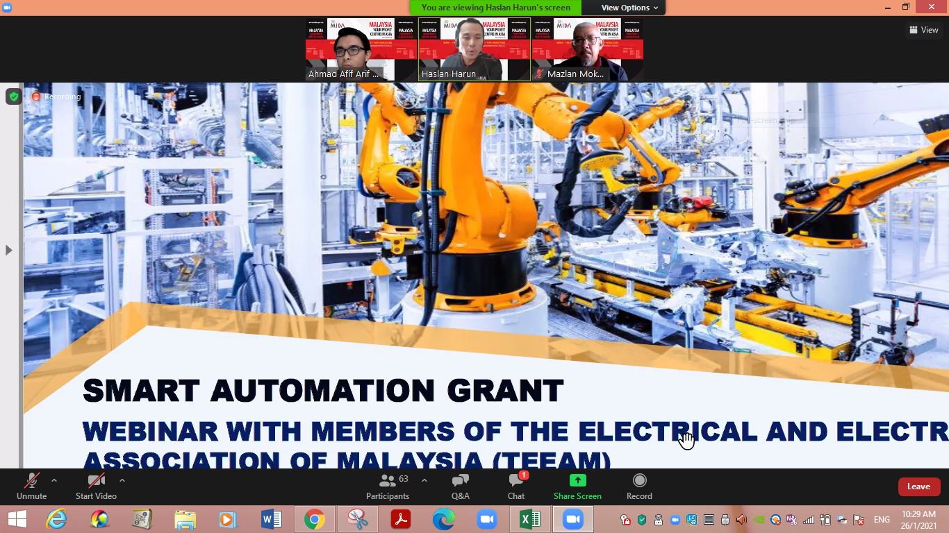 TEEAM together with MIDA successfully organised an exclusive Webinar on Smart Automation Grant (SAG) for TEEAM Members on 26 January 2021. It attracted 90 participants. The webinar provided an overview of the grant which comprises eligibility criteria & expenditure, evaluation and approval process. MIDA also offered an interactive one-to-one Virtual Consultation session...