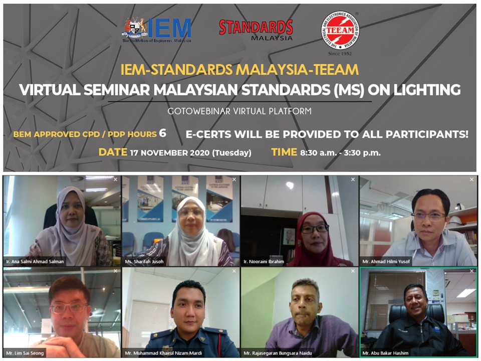 A Virtual Seminar on Malaysian Standards on Lighting was successfully held on digital platform GotoWebinar on 17 November 2020. It was jointly organised by IEM, Standards Malaysia and TEEAM. Experts shared their knowledge on lighting technology/fundamentals, lighting requirements/specifications and lighting testing. The seminar drew a good crowd of 120 participants.