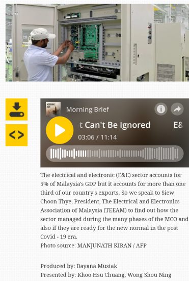 July 23 – The electrical and electronic (E&E) sector accounts for 5% of Malaysia’s GDP but it accounts for more than one third of our country’s exports. BFM 89.9 Business Radio Station spoke to Mr Siew Choon Thye, President of The Electrical and Electronics Association of Malaysia (TEEAM) to find out how the sector managed during the many phases of the MCO and also if TEEAM is ready for the new normal in the post Covid – 19 era.