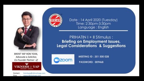 The TEEAM Manufacturing Committee initiated a Webinar on “Prihatin Stimulus Q&A – Briefing on Employment Issues & Labour Laws”.  It was presented by our Legal Advisor, Mr Brent Yap on 14th April 2020 at 2.30 pm through Zoom platform.